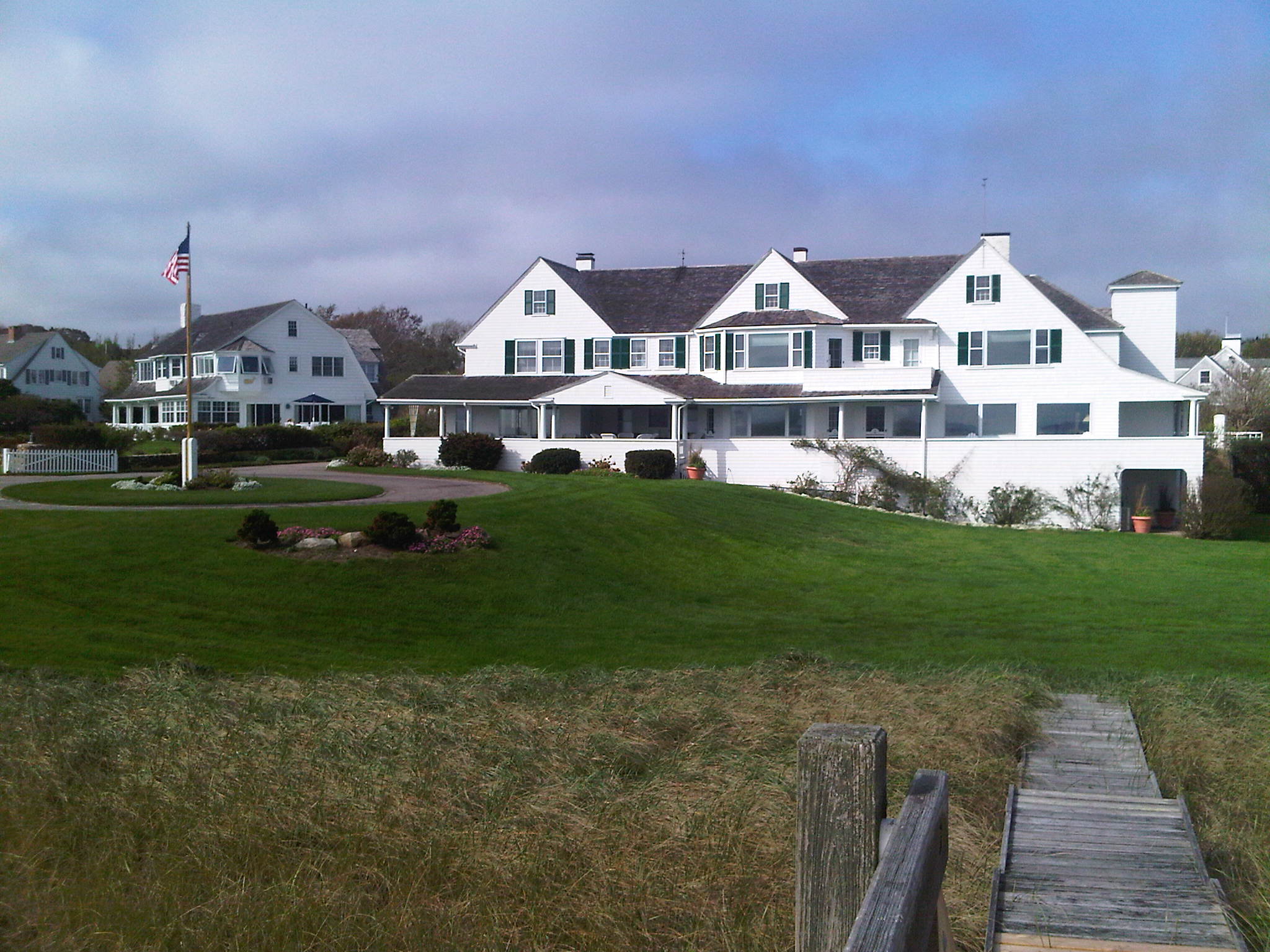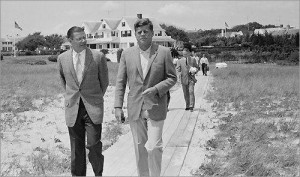 We just returned from a fabulous weekend getaway in Cape Cod where in addition to gorging on lobster and watching whales frolic in the Atlantic, we went in search of the Kennedy compound in Hyannis port and found it by way of a path to the beach through a public park. The compound consists of about 5 houses on 6 acres of waterfront land on Nantucket sound and is marked by two giant American flags flying at full mast in front of the main cottage- house built by JFK’s father Joe.